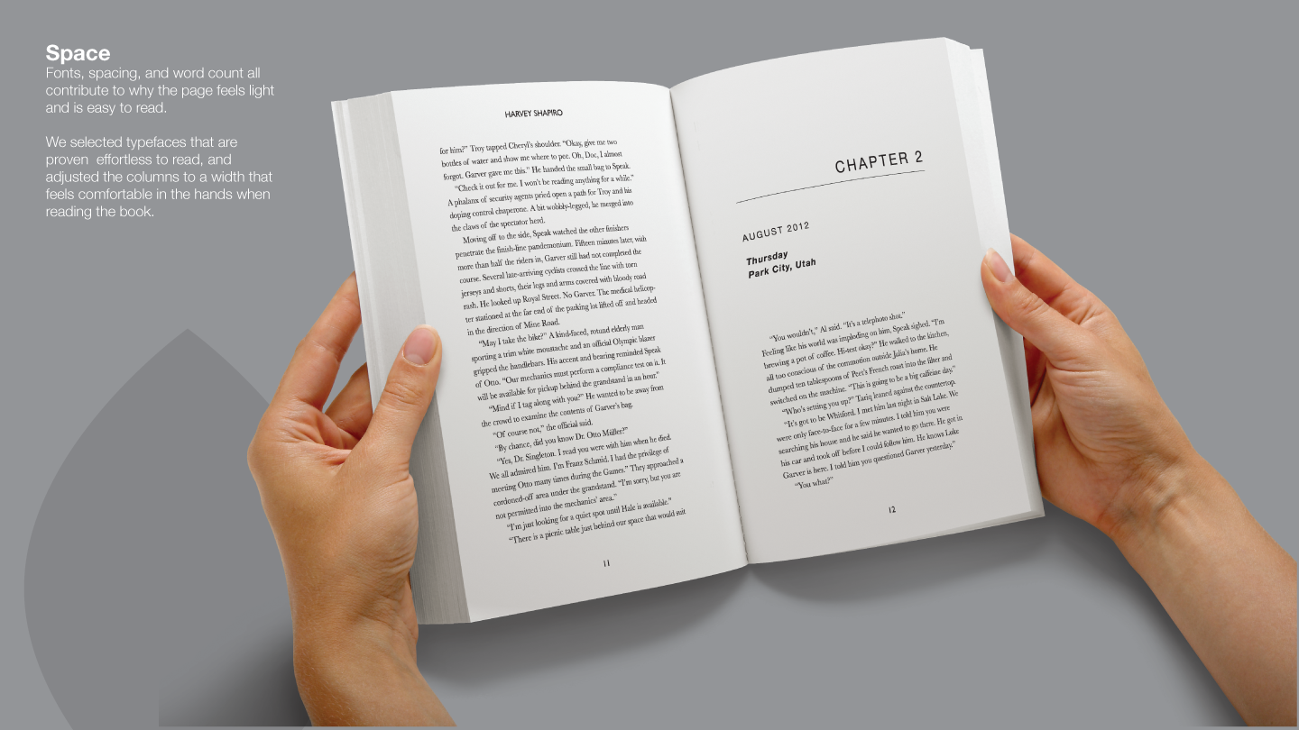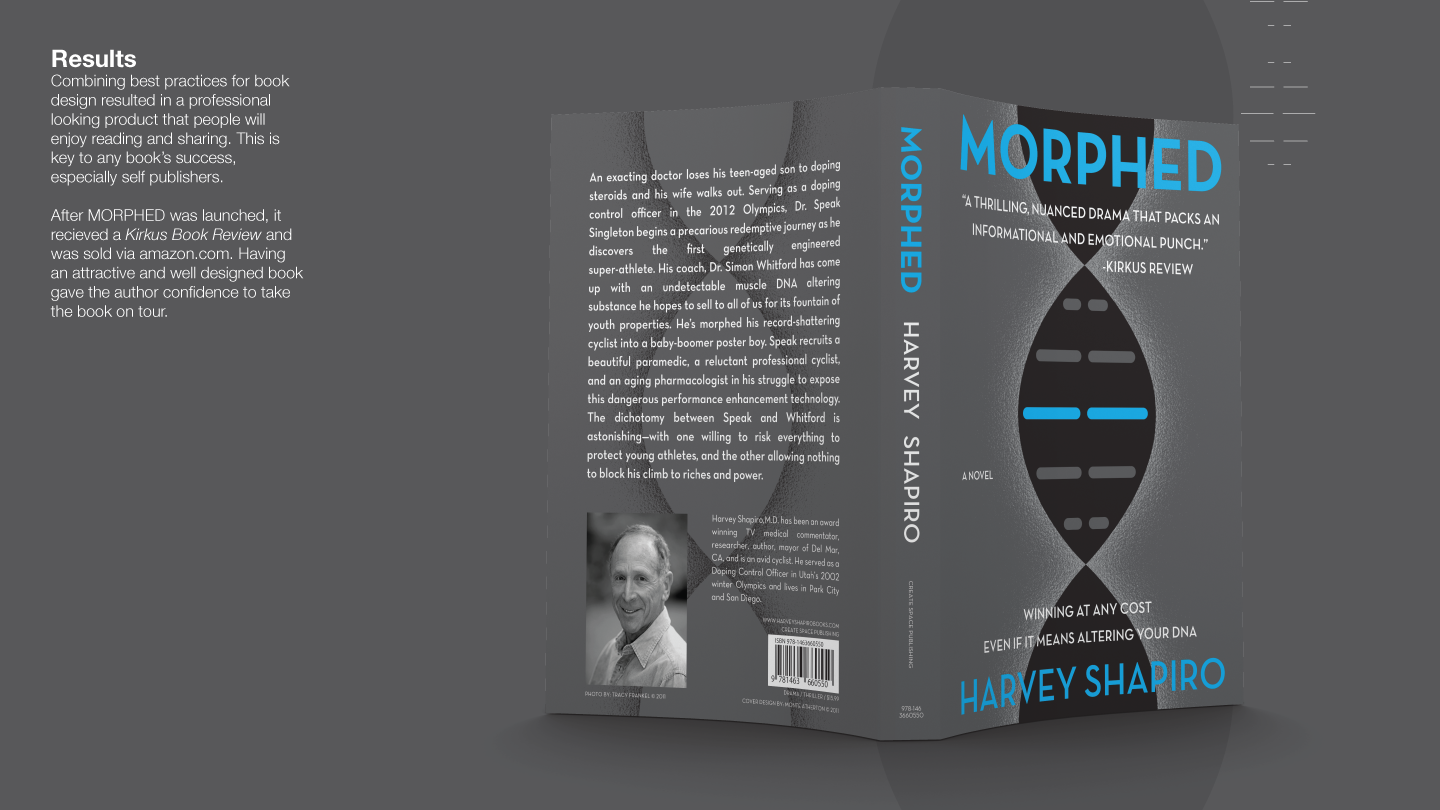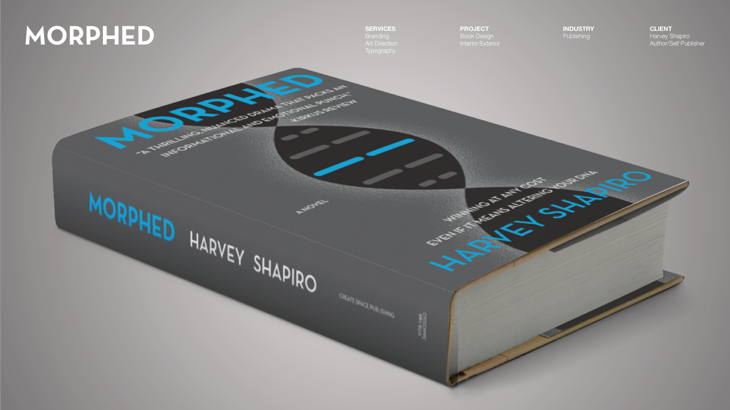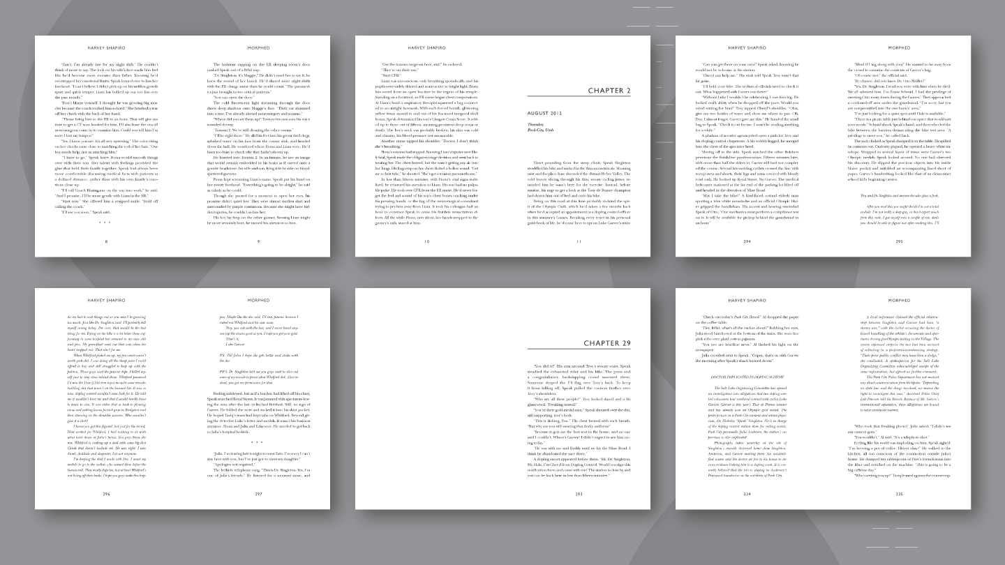 This is a book design for a novel about sports medicine and doping called MORPHED. We designed the book cover and set the typography for interior spreads. In addition, we developed the ebook versions for amazon's Kindle as well as other ereaders.